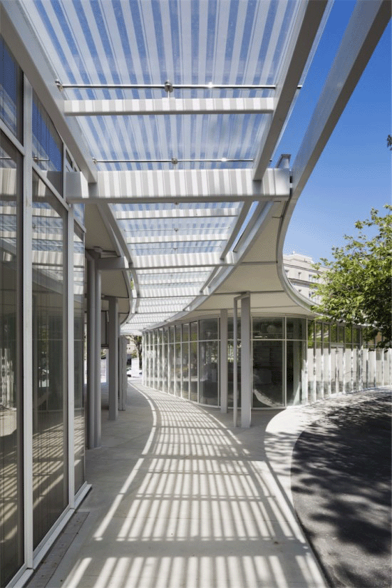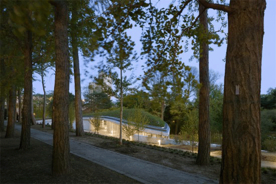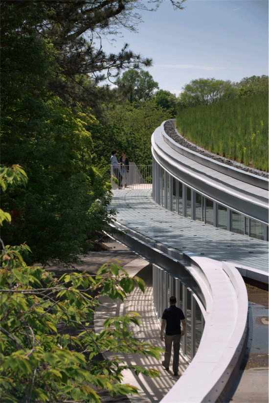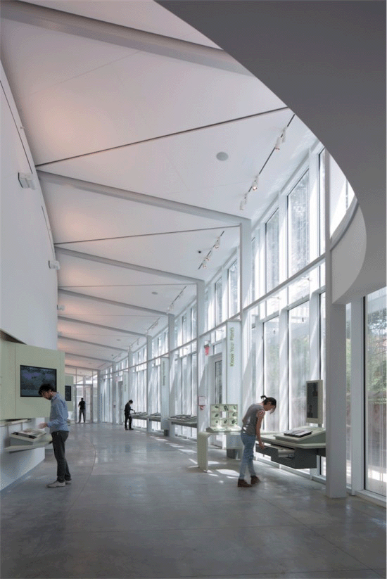 游客中心的弧形玻璃墙壁使植物园的景色变得朦胧,烧结多孔玻璃可过滤光线,防止鸟类冲撞客人。建筑北立面与南立面形成对比,建造在原有的狭道中,从而提高了热效率。北立面的天窗玻璃连同南墙的烧结多孔玻璃,可最大限度地减少热增量,并使自然光照最大化。地热交换系统为室内空间供暖和制冷,而一系列的雨水庭院收集雨水径流并过滤,改善对暴雨的治理。