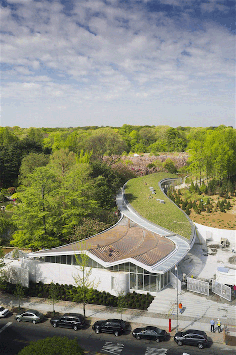 绿色屋顶将在一年中不断变化,在每个都能改变建筑的特色。靠近华盛顿大道的建筑屋顶由褶皱铜皮覆盖,与植物园的标志性建筑、建于1917年的McKim, Mead & White行政大楼相互呼应,而且最终将会被风化成绿色。