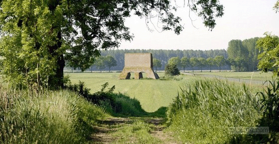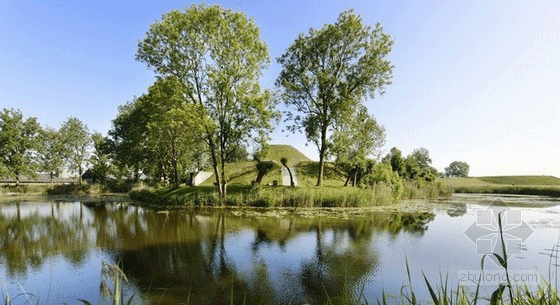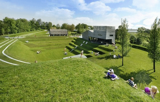 场地的前身是荷兰水线上的一个战略防御要地,这里在高强度雨洪时用于泄洪防洪。如今这里已经废弃,政府和相关机构希望这里改建成为一个吸引公众的风景休闲地,供举办不同的公共活动。Rietveld景观事务所创造出一个有凝聚力的设计,实现了各方的期待。设计的灵感来自场地的历史,也尊重这里的历史。设计可以看成一个巨大的,与历史元素(比如掩体建筑和圆形剧场)结合的大草坪雕塑。设计将这里分为不同的活动区域,形成一个新的公共领域,有望成为荷兰水线上的新景观。