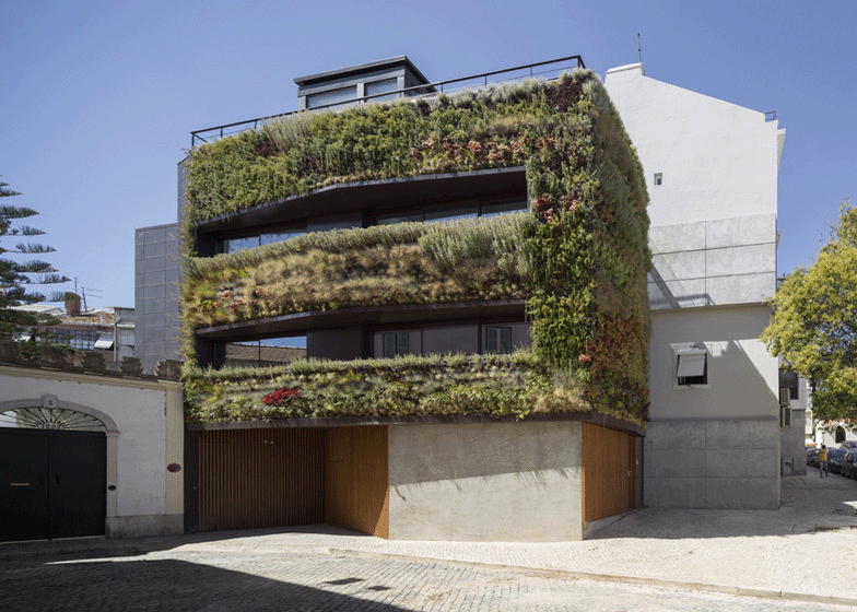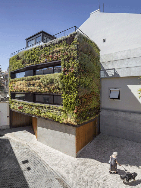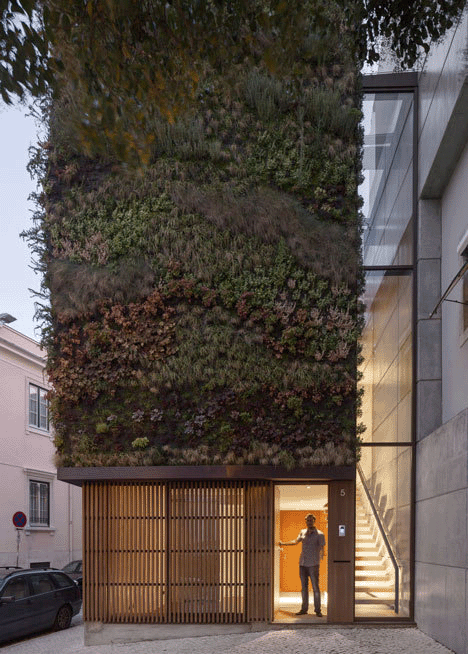 里斯本的这栋排屋整体都覆盖了茂密的灌木植物,并带屋顶泳池。它由葡萄牙建筑师设计,三层楼的住宅被设计成一座垂直花园,栽种了25个不同品种的伊比利亚半岛和地中海植物。