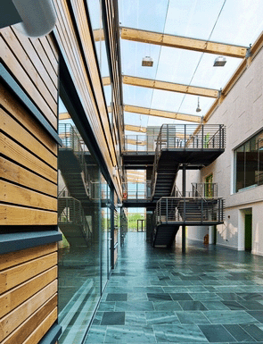 建筑的立面使用可持续性的木料搭建,由三座建筑组成。孵化器楼有着54个灵活的商业单元,中间是一个安装了EFTE顶棚的“街道”,所有的小公司都可以在“街道”上展示他们的产品;第三座建筑是一座弯曲的楼体,容纳了一个可容纳300人的讲演厅以及一座咖啡馆和会议设施等。
