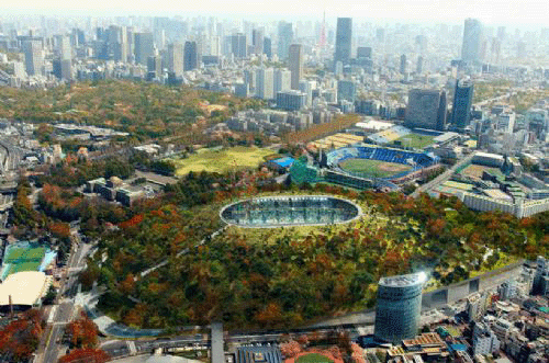 这个巨大的绿色屋顶参考了有百年历史的明治神宫外苑森林,它是用旧体育场的再利用建材制作的,同时还具有多种功能。除了为体育场创造了一个自然景观,在钢筋混凝土的都市中心创造了一个庇护所,它还为参观者提供了独特的观景视角,还将体育场室内外隔绝开来。建筑还能收集雨水用来浇灌屋顶绿植。