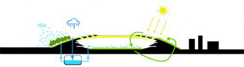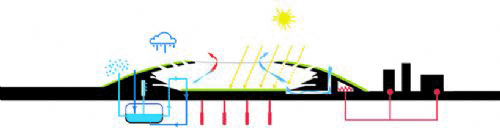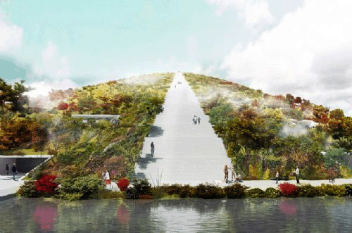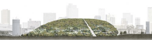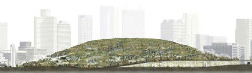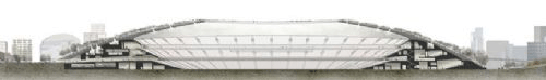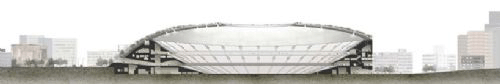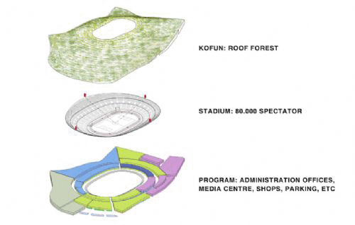 此次入围2012年日本国家新体育场国际设计竞赛的又一方案是来自巴黎事务所dorell ghotmeh tane的“kofun stadium”,这个方案将绿色屋顶的设计概念最大化。考虑到新体育场巨大的尺度,以及位于东京市中心的特殊地理位置,这个方案打算创造一个泥土建造的纪念碑式建筑,它能与基地和谐地融为一体,而不是像一个技术性的外来品,可以被放置到世界任何一个地方。为了让新体育场能够全年使用,建筑师设计了一个可伸缩屋顶,场馆将把所有体育赛事和娱乐活动都放在一个完整的空间中举办。