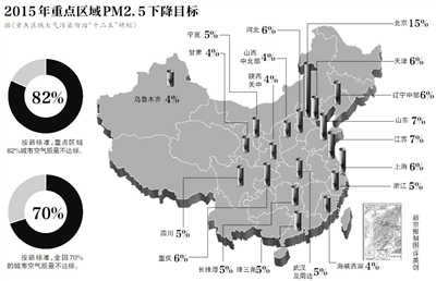 对于北京15%的目标,北京市环保局大气处处长于建华解释,北京市早在规划出台之前便制订了本市的PM2.5下降时间表,自己给自己设定了到2015年下降15%的力度很大的目标,环保部目前的规划便沿用北京市自己的目标。