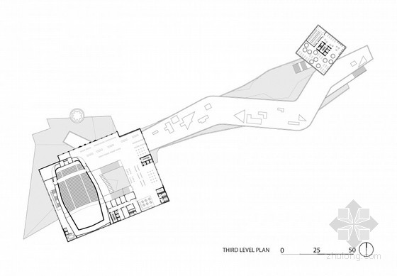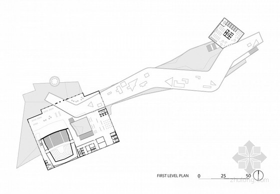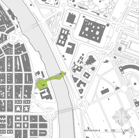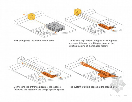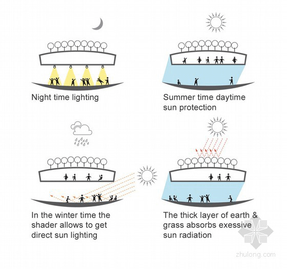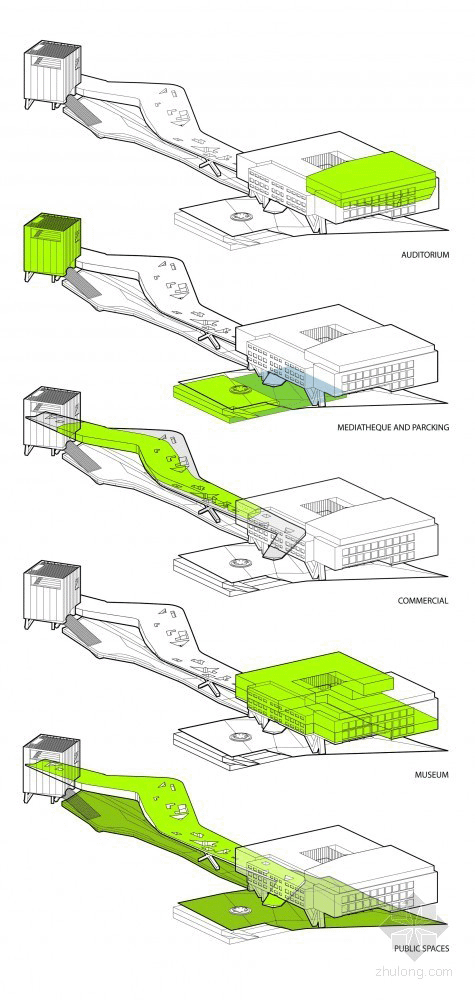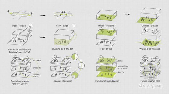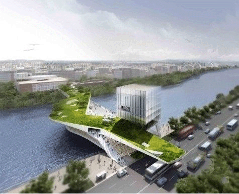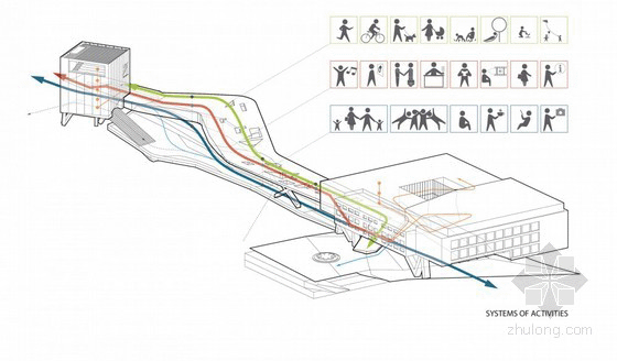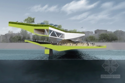 这座建筑也不仅仅是关于假日和文化的一角,更重要的是人们之间的交互作用。人们来到这里可以参观孩子们的操场、图书馆、杂货店、夜酒吧、小吃店或者与朋友闲逛等。该设计将会见证市民生活的活力,成为展示生活的舞台。桥上蜿蜒的地面形成了波纹般的褶皱,人们可以坐在上面看着过往的行人。设计师以这种空间激发了不同的行为模式——看与被看。双层桥面不同的特质反映了更广泛的诉求,上层的绿色空间在喧嚣的城市中创造出了一片净土。种满青草和灌木的土地向周围散发着清新的味道,并且为下层桥面提供了大片阴凉。咖啡厅、购物区和展览空间都在这层中,使该建筑的活动更为丰富多彩。下面那层也将会成为一个热闹非凡的地方,到处是街头表演、摊贩、咖啡店等,所有现代都市的街头元素在这里都能见到。