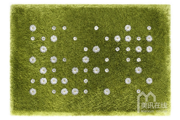 采用类似玻璃的柔软材料编织而成的地毯有着青绿色的草感绒毛,其中内藏有84个圆形接口,可以让你把雏菊“种植”上去,排列出各种图案,每天都有焕然一新的感觉。