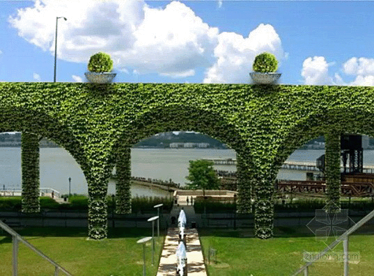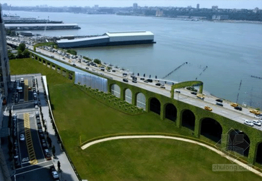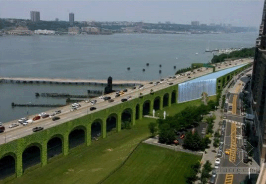 设计师在曼哈顿西区的高速公路两边利用多叶攀爬植物形成网格状结构和绿色瀑布。原先的高速路就只是简单的城际公路结构,横跨在哈德逊河和周边城市区域之间。设计师对这段高速路两边的区域进行了美化,将原本难看的事物变成让城市感到骄傲的、让所有人眼前一亮的事物。高速路经过美化后,两边成为了垂直常春藤花园,看上去就像是绿色瀑布,与旁边的公园相得益彰。设计师先在高速路两边安装了轻质网格结构,然后在网格上种植常春藤等攀爬植物。这样的景观不仅能美化城市空间,还具有清新空气的作用。