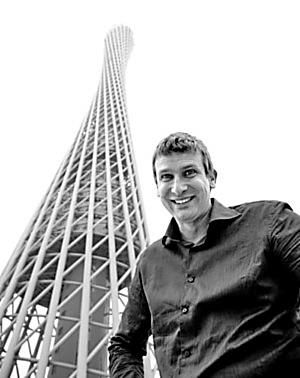 荷兰建筑师马克·海默尔和他设计的中国第一高塔――广州电视台(“小蛮腰”)。
