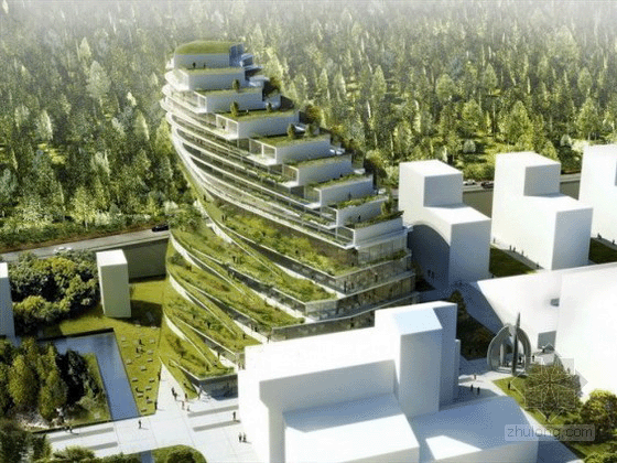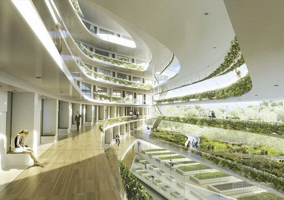这是由3XN Architects事务所设计的位于瑞典斯德哥尔摩的一个学校项目,这是一款新式的学校,从教学当地植被,到种植及收获自己种植的食物,学校采用的是一种完全不同的教学模式,而且它包含终生教育体系,从幼儿园到高中到大学,甚至是老年公寓。这个建筑由两个拱形组成,绿色学校及相伴随的温室组成了公共的拱形,它使内外的流通和绿色的环境时时发生着联系。学生住宿和老年公寓的九层空间相互交织,转换,形成很宽阔的私人阳台和尽可能多的日光吸收。一个开阔的中庭穿过建筑中心,容纳学习空间,这个绿色的通道在最高处以一个巨大的温室结尾,温室包含三层封闭的楼层,以获取最佳种植环境,同时向上延伸,包含漂浮花园,垂直农业等元素。