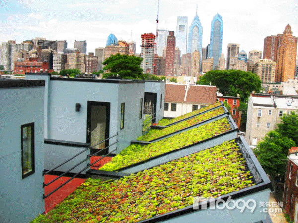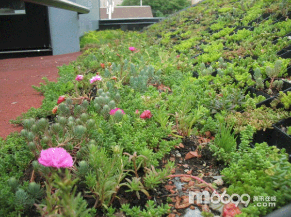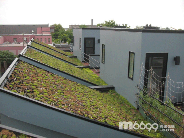 由Green Roof Works设计和建造的葱翠的屋顶可以用来遮挡紫外线,延长屋顶的使用寿命,同时还可以给附近的居民带来一抹清新和健康的氛围。景天植物和其它肉质植物并不是水平种植,反而是想着房屋倾斜,给人一种绿色景观就在窗户外面的感觉。植物同时可以减少热量的吸收,保持室内凉爽,防止雨水流失。