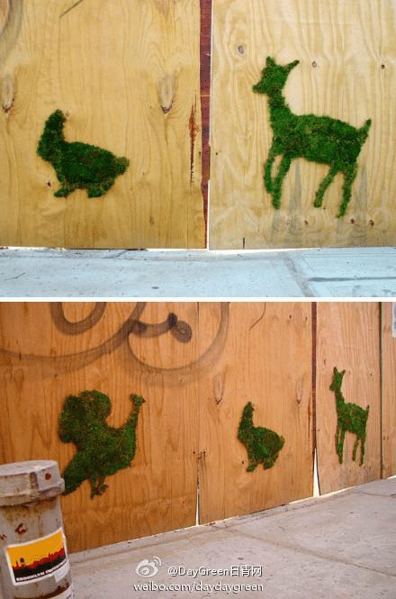 有趣的墙面模子,作者在木板上用草皮拼出各种动物的形象,垂直在路边,给水泥小道带来了自然的味道~