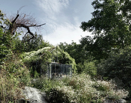 这个废弃的车库位于意大利阿尔卑斯山上,屋主想把这个车库重新打造作为工作室,于是设计师在这个车库的外围安装了一些轻钢框架,在上面种植了一些阔叶藤本植物和开花的藤本,使其自然生长,把车库完全覆盖,营造出一个宁静的私人空间。