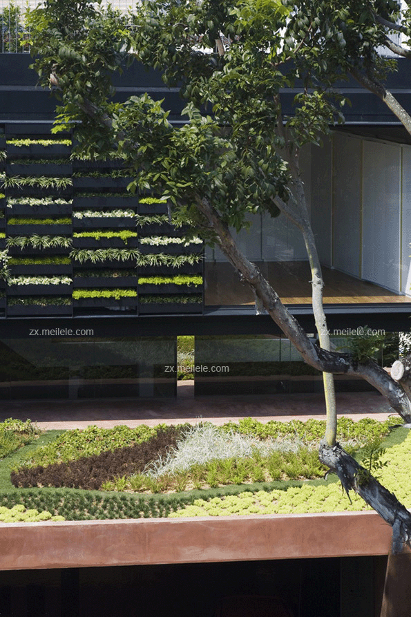 建筑立面的上层封闭空间内有一层种植系统,这里向是一面幕墙。其主要功能是作为私人屏幕之用和挡雨。墙壁上的细节设计非常让人惊叹,它看起来就像是个有机体。植物幕墙能满足建筑的公用,也表达了人类对自然的喜爱。