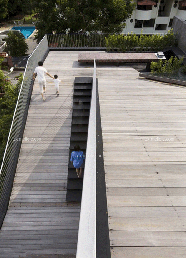 斜面屋顶平台设计在交错复杂的建筑体中,保持了和室内的连通。在屋顶上休息是一件很惬意的事情。倾斜的屋顶景色让人想起波浪起伏的平台。斜面更适合人们一同躺下来观赏风景,分享感受。