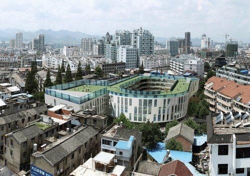 天台赤城二小学建筑设计,来自杭州的零壹城市建筑事务所。天台赤城二小学是省内乃至国内第一所将200米环形跑道置于多层建筑屋顶的小学教育建筑。这一充满智慧的概念缘于场地极为有限的用地面积:将200米的标 准跑道放置在屋顶上,从而为学校在地面上赢得了额外的3000平方米的公共空间。同时,椭圆型的教学楼给学生们带来了一种内向性的安全感。