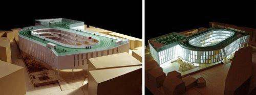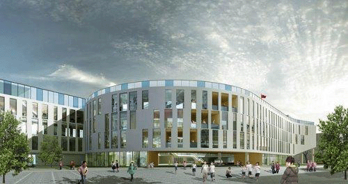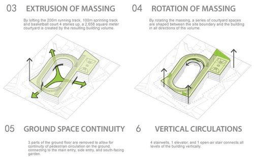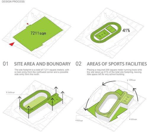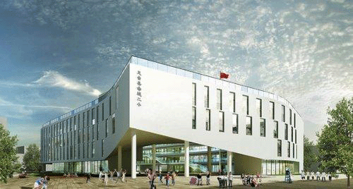 对跑道放置在屋顶的处理令建筑层数能按照要求控制在四层,跟周边建筑关系更为和谐。为了提供更多可用的绿色庭院空间,建筑体块旋转至跟场地边界线产生十五度角,从而在建筑外部与场地边界之间创造数个小广场空间。该项目将2013年9月建成使用,届时它不仅将成为天台人 民引以为豪的标志性建筑,也将开启如何通过建筑因地制宜、利用屋顶空间、打造节约型社会下的教育建筑的新篇章。