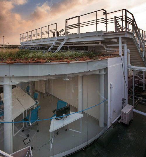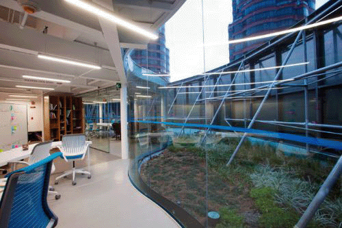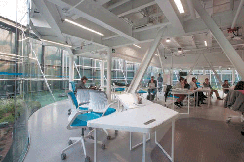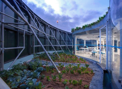 作为可口可乐公司与墨西哥城rojkind arquitectos事务所以及AGENT正在进行的合作项目的壹部分,设计师将一个废弃的屋顶和直升机停机坪改造成“transformadora ciel”的联合工作空间。这个空间是利用回收的金属结构搭建的,大部分设施都暴露在外,尽量减少不必要的装修花费。原有的停机坪结构被重新利用在办公室建造上,设计师还建造了一个全新的绿色屋顶和雨水收集系统,让这个小环境可以自给自足的运转。曲线形的室内空间布置在屋顶的边缘处,可以接收到充足的自然光线,让整个工作区域变得明亮起来。当地生产的模数化家具布置在开放的流动空间中,座椅可以自由布置,创造了灵活动态的工作环境。人们可以到屋顶花园观赏绝美的城市景色,缓解长时间办公的压力和疲劳。太阳能光电板几乎可以完全支持低能耗的LED灯光照明设施,水性的墙面涂料也最大限度的减轻了对室内空气环境的影响。