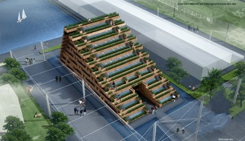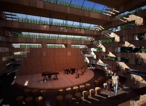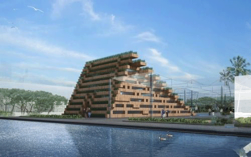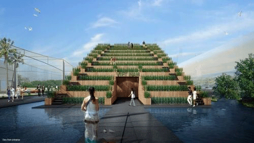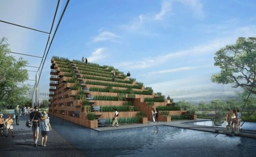 建筑由大量不同模块的钢框架结构组成(其中最长的7.5米),并通过简单联接或重叠交叉的方式连接起来。框架结构上覆盖着的是回收再利用的木材,可以节约成本。该展览馆坚定稳固,绿色植被增添春意,同时还运用一系列新技术(备有水、电供应以备逃生)。建筑的覆土部分有利于形成微气候,同时为建筑内部及外部提供养分。