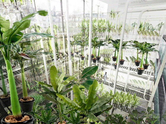 包含在一个中型的封闭玻璃的巴黎商业大厦内,这个迷你垂直农场也可以作为一类城市植物园或垂直花园。虽然这个大厦的高度机械化设计的主要功能是促进和发展农业城市化,它也会创造街上有趣的视觉焦点。它的玻璃幕墙可以让自然光渗透到农场,再利用一点点额外的人工照明,创造出香蕉种植的最佳条件。农业生产将占据相当于六层楼的面积,并雇用一个由内部桥梁进入的链转动系统。