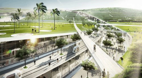 BIG事务所的方案以城市形式结合开阔景观,将成为De Gonesse三角区的文化与商业聚焦点。中心在景观中浑然天成,设施均覆盖绿色屋顶,并配备休闲空间、步行路径和城市农业。中心与未来大巴黎快速轨道连通,可直接通往戴高乐机场。