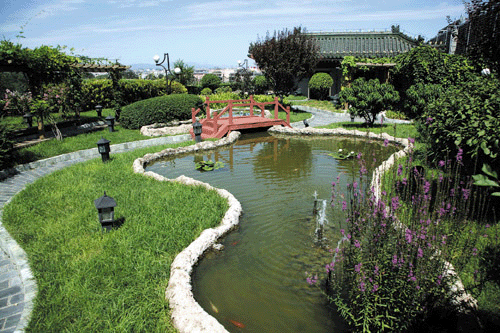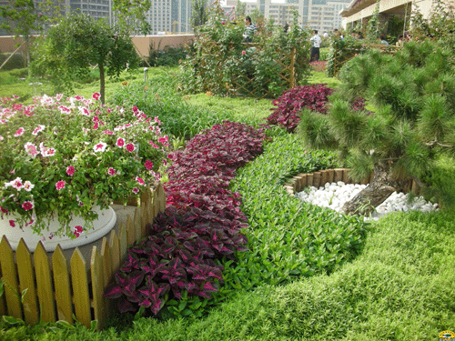 精细式屋顶绿化:指的是植物绿化与人工造景、亭台楼阁、溪流水榭等的完美组合(如图3)。它具备以下几个特点:以植物造景为主,采用乔、灌、草结合的复层植物配植方式,产生较好的生态效益和景观效果。一般构造的厚度为15~3750px,经常养护,经常灌溉,重量为150~1000kg/m2。