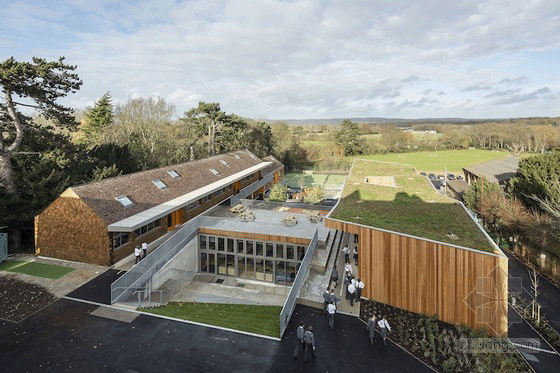 这个开发项目由低层建筑的两翼延伸到了陡峭斜面地基上,它的意图是重建肯特原野的广阔视野——虽然它如今已被许多临时教室所掩盖,并且用感性的景观将建筑与保护区融合在一起。作为“充满动力与活力的学习性景观”,这里包含了一系列娱乐区域,它被不断调整以适应不同年龄段的人的需求。亮色的表面“起伏波动、富有变化,为室外教学及娱乐区域创造了全方位的乐趣”。欧洲赤松林与桦树林将这片区域“赋予了人性化”,它们提供了大量休息与庇护区域。由土工布加固的野花池和绿色屋顶更是增添了更多生态元素,与当地的生物多样性形成了呼应。
