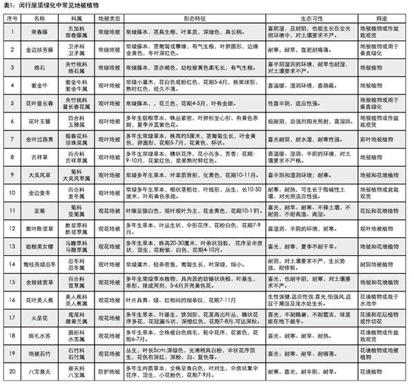 4.6 尽量选用乡土植物,适当引种绿化新品种。乡土植物对当地的气候有高度的适应性,在环境相对恶劣的屋顶花园,选用乡土植物有事半功倍之效,同时考虑到屋顶花园的面积一般较小,为将其布置得较为精致,可选用一些观赏价值较高的新品种,以提高屋顶绿化的档次。