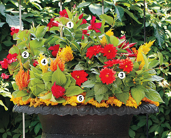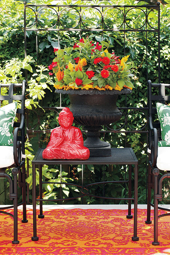 这个奇特的花卉组合让人想起热带地区的天堂,盛装这盆花卉的是一个经典的铸铁容器。层层叠叠的红蝉花和粉色的海棠,让人感受到异国的热辣风情。此外,这盆栽还搭配着明亮的羽状鸡冠花和橙色得大丽花。这些暖色调的组合搭配,仿佛流动着一股华丽的空气,折射着热气腾腾的夏季风情。这个盆栽完美体现了独特腔调,像琉璃佛像或一个异想天开的微型花园。