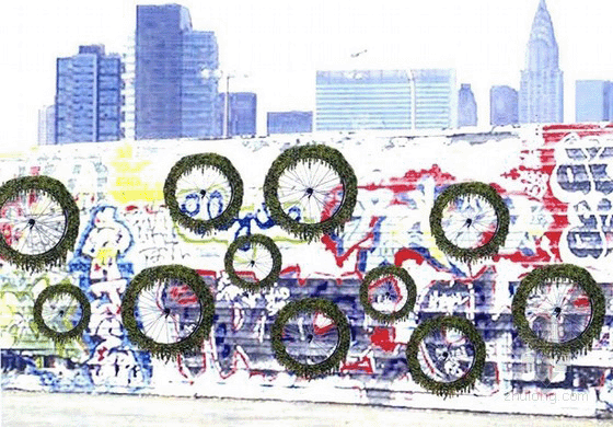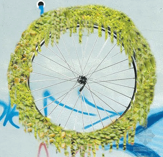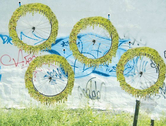 这些自行车轮花盆由墙面固定的钢架支撑。设计师将多孔的布料包裹住水培植物生长介质石棉块,然后将轮子的橡胶轮胎换成这些材质。之后他在其中每隔约15厘米种植红色马拉巴尔品种的菠菜种子。