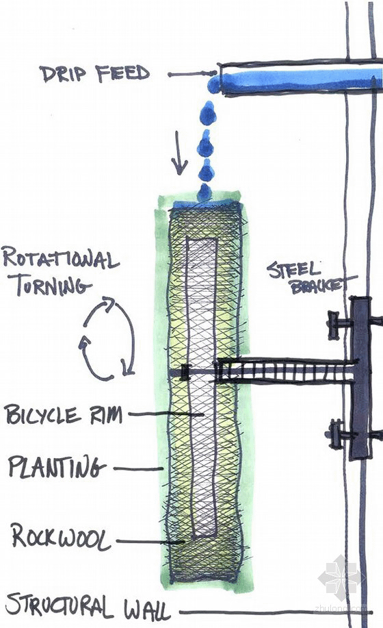 蒸发和饱和作用产生动能。自行车轮花园墙利用单个点滴水培系统,系统在每天早上9点至中午12点开始在轮子的上方滴水。当首先接触水源的石棉介质开始饱和,水的的重量使轮子转动,整个轮子的介质得以灌溉。而生长的菠菜对于不断变化的中心反应良好。