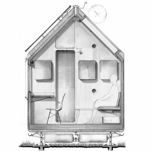 小屋前后都有门,从前面进入就是起居室,左侧是折叠桌和椅子,右侧是一张长沙发,但长沙发打开后就是一张宽1.2米的床,可供身高1.83米的人睡觉。起居室的采光设计合理,桌子靠着的一侧墙壁上有一扇长方形的窗户,另一侧屋顶上也有一扇窗户,可以保证足够的阳光射入起居室。