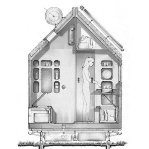 走过起居室,在靠近小屋后门的位置就是厨房和卫生间。厨房的台子上放着一个电炉,厨房墙壁下方还内嵌一个冰箱。卫生间与厨房相对,里面装有淋浴和嵌入式马桶。起居室与厨卫间的隔墙,挖进去一块可以容纳一些小物件。