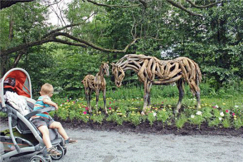 这个作品有点不同,它是Heather Jansch of Britain 制作的雕像,名为“奥德赛(母马)与希望(小马)”。这是用废弃的木头雕成的,是一件环保作品。