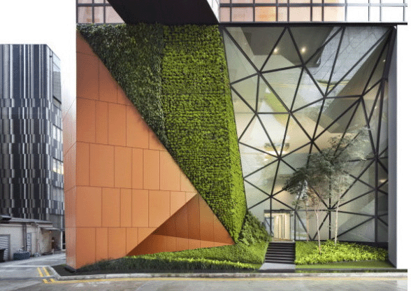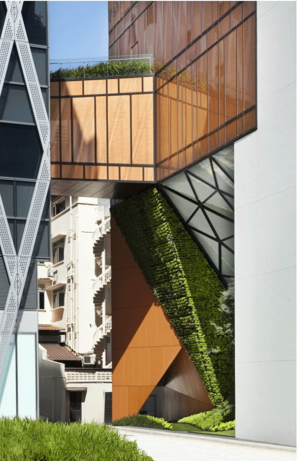 这是一个改造项目,建筑就在宾乐雅酒店的对面,芳林公园的旁边。WOHA运用几何符号和绿色植物墙创造了一个魅力的入口,采取斜角,通过异性空间造型吸引了所有人的目光,雕塑般的现代设计,全景屋顶花园,绝好的户外景观,重视环保与节能,结合新加坡美丽的海景和自然环境。WOHA创造了又一优秀建筑作品。