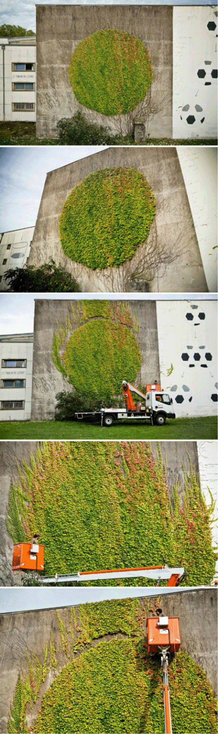 在法国的Besançon的一座工厂外墙上,人们可以看到一面由绿色植物组合而成的圆。 这个绿色的圆是由西班牙艺术家SpY设计的,并为其起名为“Grow”,为的是为人们带去正能量,而绿色的颜色则正与主题相契合。
