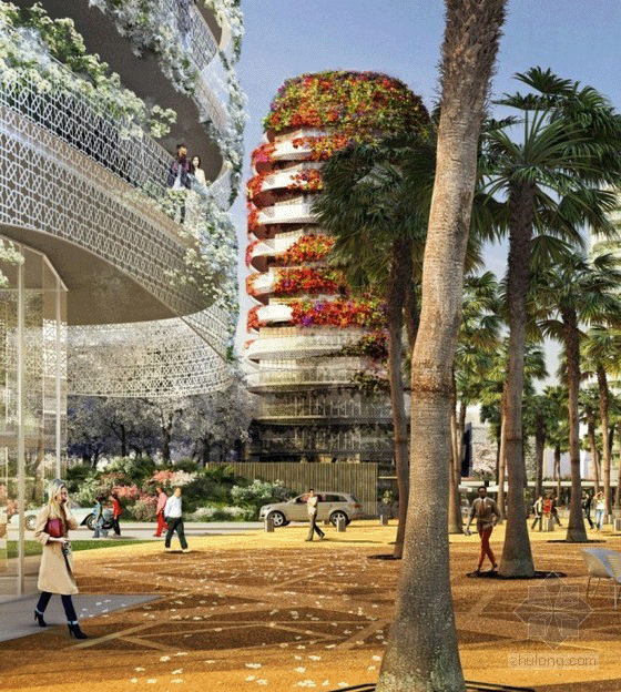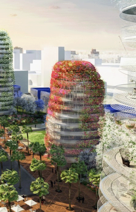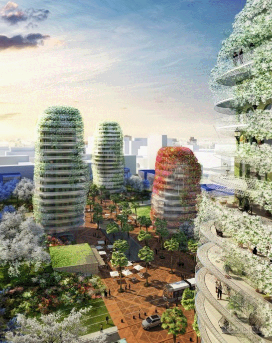 该计划中包括3栋高层住宅楼、1栋低层办公楼以及一系列由中央广场相连,并在一个郁郁葱葱的五彩山水中隐蔽的住宅大厦。每一个“有机形”塔将被设计成格状的外观,培育的九重葛和茉莉将这些塔伪装成花园的山峰。