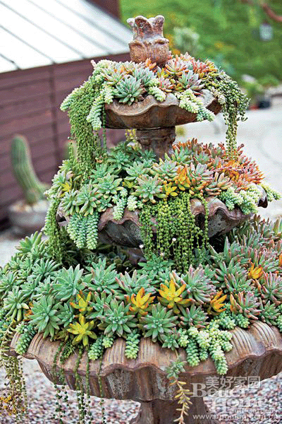 Jeanne也喜欢自己组多肉植物盆栽,常用到的素材是墨西哥景天,比如新玉缀、金色的铭月,它们的叶片只有子弹大小,但是没有它们的欧洲替代品种那么耐寒。通常,这些欧洲的替代品种的叶片会更袖珍。在有花园聚会或朋友到访的时候,Barry会开着车接送客人驶过花园中悠长而陡峭的车道,沿途人们看到他们丰盛的多肉植物花园,第一反应就是回去自己也要设计一个同样的花园,铲除原来花园里的草坪,甚至还有些朋友强烈要求下次带自己的花园设计师过来取经。这个用多肉植物和仙人掌组成的低水需花园已经是周围人纷纷效仿的典范。