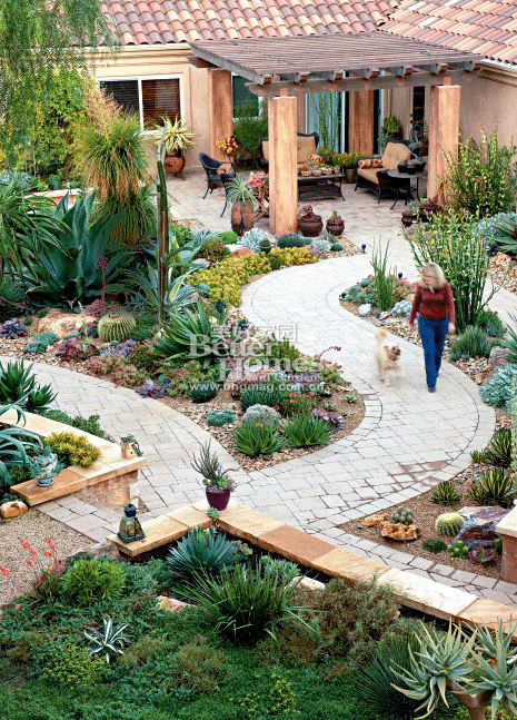 花园工具房里存放着整碗的彩色碎玻璃,它们是Jeanne用来装饰盆栽的,透过天窗的光线闪闪发光。附近的小木屋则用来庇护她的植物和繁殖新的幼苗,根据季节Jeanne会从高抬花床收获到沙拉菜、番茄、南瓜、草莓和十几种香草。夏天,她喜欢用绿薄荷的叶和冰水调制饮料。尽管蔬菜花园里的作物看起来与外边的多肉植物、仙人掌风格相差甚远,但它们的位置集中在几处岛状的区域,通过的重复景观的手法,让它们看起来不那么突兀。从视觉的角度说,也促进了房子与花园中黄褐色的灰泥矮墙之间的协调问题。虽然花园的设计是以耐干旱为主题,这并不意味着花园没有完善的灌溉系统。毕竟南加利福尼亚州有时会出现几个月无降雨的情况,此时就需要灌溉系统登场。多肉植物虽不像养护草坪、玫瑰或一年生植物那样费水,但常规的给水会让它们有最出色的表现。