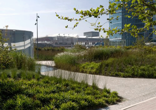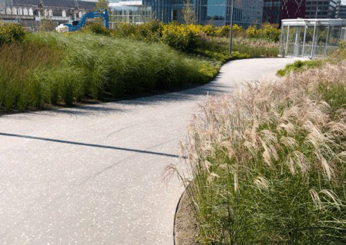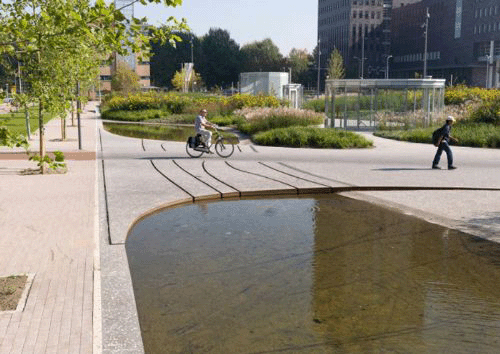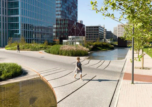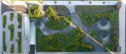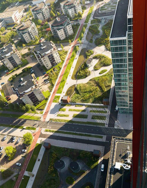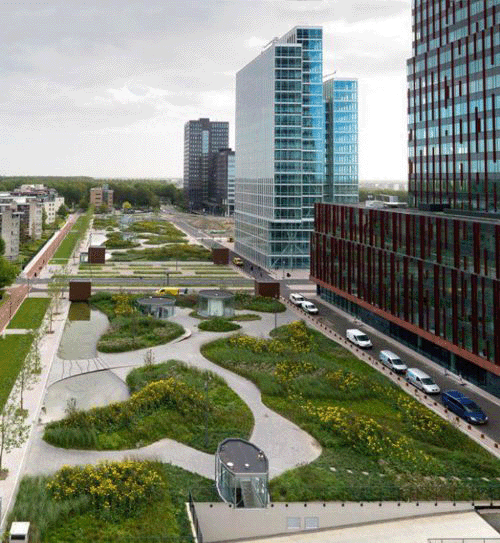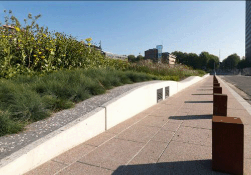 这座公园位于两个四层地下车库的上方。长200米,是荷兰最大的屋顶公园。该公园是一个高度城市化区域的绿洲,景观、水景、草、多年生植物和开花灌木充满其中。从塔顶看,公园中的色彩错落有致,改变了整个季节的颜色。 繁华的梧桐树大道,明确了公园的视觉和空间边缘。一个200米长的池塘沿着公园的北部边缘,使公园看起来更加自然。路面是的水磨石沥青,与周围环境完美融合,打造了一个连续的、无缝的平面。