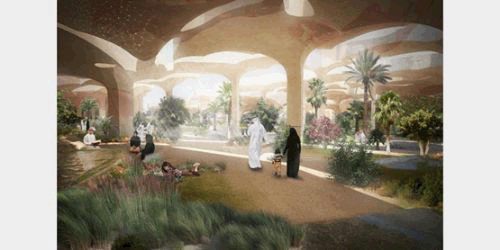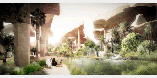 他说:“这些建筑形成了一种可以遮阳的顶篷,挡住火热的沙漠阳光,在建筑下面,园地的植物能够正常生长。”