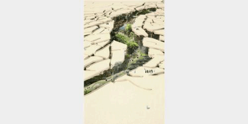 托马斯-赫斯维克说:“艾尔-法亚赫公园包括一系列的非常特殊的廊柱建筑,像沙漠表面的裂纹。这些建筑柔和地从地面升起,形成一种三维的景观。”