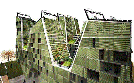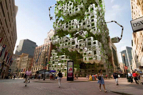 在经济不景气的环境下,美国波士顿许多正在建造的工程都处于停工状态。由于没有足够的资金继续建设,它们都成了一个个只有框架结构的烂尾楼。波士顿豪勒-尤恩建筑事务所认为这些烂尾楼其实都是可以利用的,因此他们提出了在这些烂尾楼上安装一个个“生态豆荚”的利用方案。这种所谓的“生态豆荚”其实就是一个个“藻类舱”,其中可以用来生产生物燃料。机械臂可以旋转这些“生态豆荚”,以保证每一个“生态豆荚”都能够接收到同等的光照。
