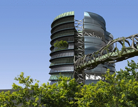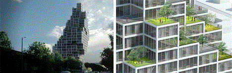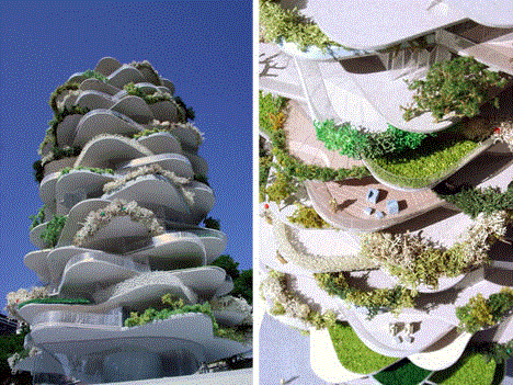 整栋建筑将由一个个立方体形状的格栅组成,每个立方体格栅围绕建筑的中心主轴而灵活分布,可以根据需要进行调整。它看起来好像堆积起来的积木,设计师们将它形容为一个“垂直村庄”。在这种全新的未来派建筑上,分布着许多平台式的空中花园。这样,人们即使居住在摩天大厦中,也有机会欣赏美丽的花园和绿色的草坪。除了这些之外,“空中村庄”还有许多生态友好型设计,比如污水再利用系统、能源生产设备等,而且建造这种建筑的混凝土也是一种可再生物质。