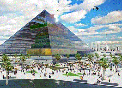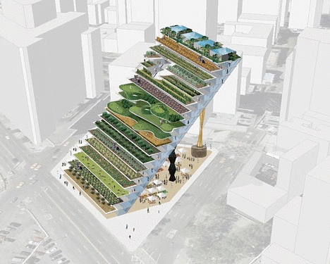 现在越来越多的人关注新鲜、绿色的本土有机农产品,因此许多建筑师都开始认真考虑垂直的城市农场。这个金字塔式农场由迪克森-戴斯波米尔和埃里克-伊尔森设计,它是一个完全自给自足的城市社区。农场本身所产生的能量完全可以满足内部所有机械和照明系统的能量需求。