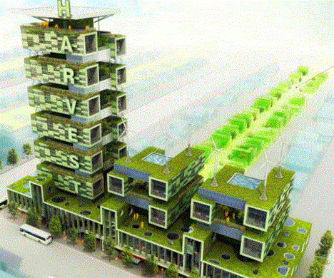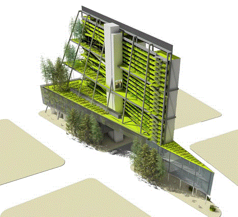 在由加拿大温哥华市所发起的一项设计大赛中,加拿大罗姆斯建筑事务所所设计的“绿色收获城市垂直农场”一举夺冠。在设计作品中,罗姆斯建筑事务所使用了“收获”一词,建筑师们并不是在故意开玩笑,他们的设计目的是这栋建筑可以用来种植水果、蔬菜、草药、可以用来养鱼、养鸡、产蛋、产奶等。