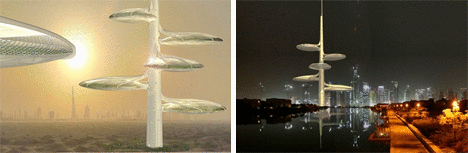 迪拜一直以新奇、美丽的建筑而著称,“海水利用垂直农场”的概念也是迪拜所有的新奇建筑设计中一个典型代表。在这个垂直农场中,圆盘形的结构就是一个个农场。海水流过建筑中心的管道,这些农场就是通过流经的海水实现冷却和补充水份。这种独特的设计可能会有些不切实际,但是它的设计思想却是利用所有可以利用的自然资源,而且在实施过程中可以采用一种比较符合实际的变通做法。