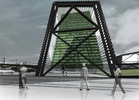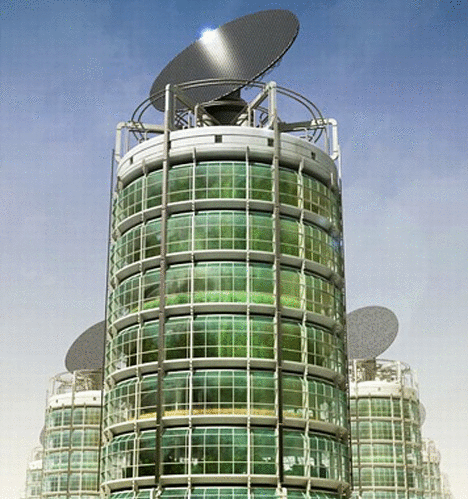 这个垂直农场方案也是最早期的城市农场设计方案之一,它由设计师克里斯-雅克布斯和迪克森-戴斯波米尔共同设计完成。在这个独立的塔形建筑物顶部,有一个巨大的太阳能电池板,它可以随着太阳位置的移动而转动,这是为了尽可能地吸收更多的太阳光线。这栋建筑物的窗户也很特别,它们具有防污染功能,而且不容易凝结水珠,这也是为了让其中生长的植物能够照射到更多的阳光。