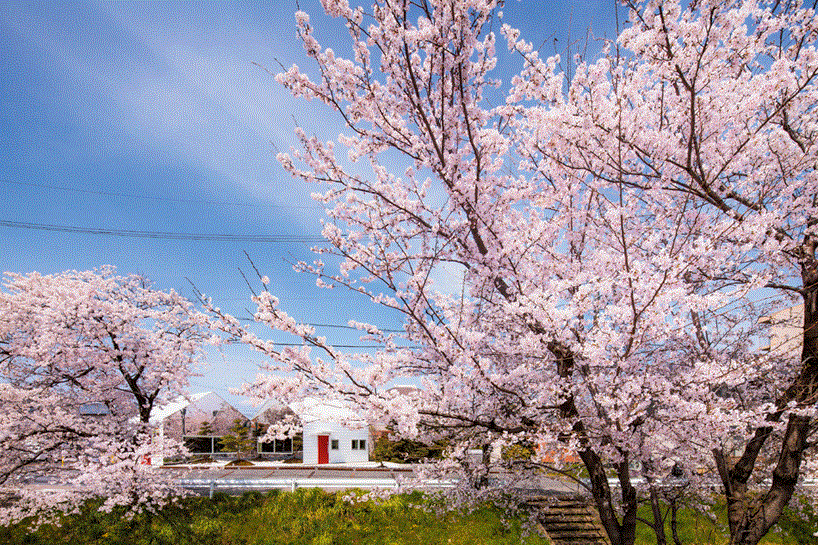 建筑物的外立面也因为这样一种独特的设计,在粉色樱花的映照下,仿佛一面花墙。