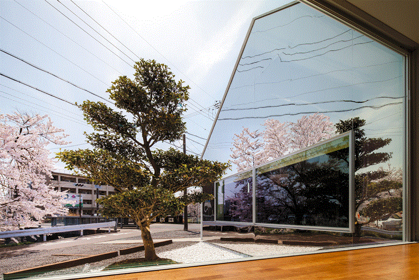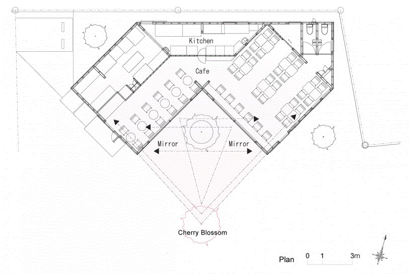 抛光的镜面外立面反射了建筑周边的居住环境,餐饮区域围绕两个窗户布置,以欣赏外部的樱花树景观。