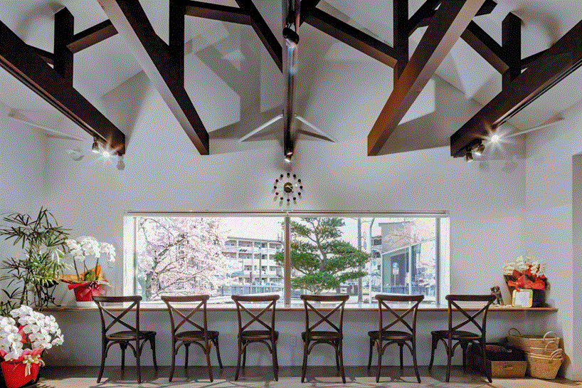 在内部,餐饮区域围绕两个窗户布置,以欣赏外部的樱树景观,一个小厨房被设计在项目的后面。为了进一步密切设计方案与自然之间的联系,屋顶的梁架采用独立的分支结构,宛如交错的树枝一般,客人身临其中,就仿佛是受到了树木的庇护。
